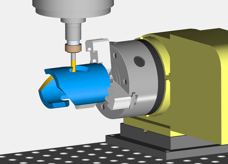 ESPRIT rotary milling is performed directly from the 3D features of solid models or from flat 2D features. ESPRIT readily programs rotary contouring,pocketing and drilling utilizing a simultaneous 4th axis. ESPRIT converts one of the standard 3-axis movements (X, Y, or Z) into a rotary C-axis movement, wrapping the profile around a rotary axis and employing an optional Y-axis offset to ensure straight walls.
